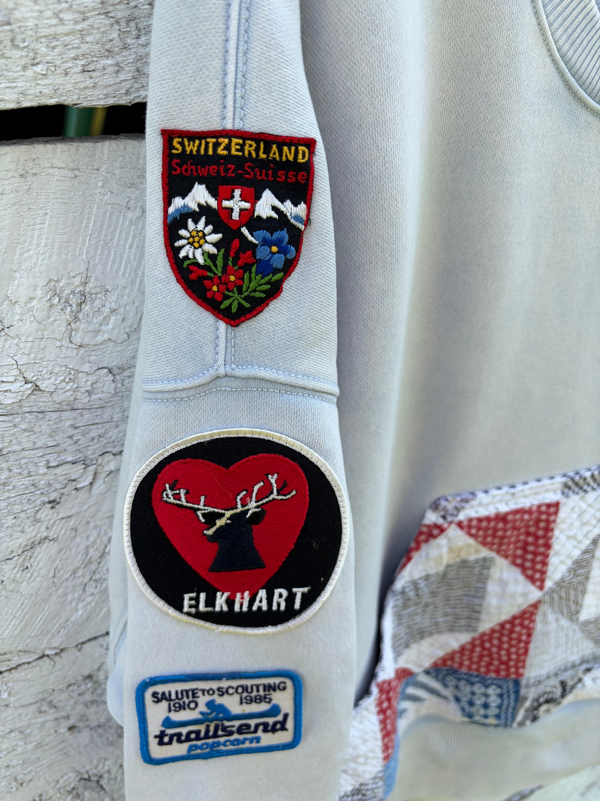 - Oversized, light blue vintage washed sweatshirt with vintage patches and quilt pocket